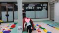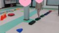 ・カップ集め(色、数指定)→横になったコーンを足で起こす→平均台・くねくね平均台(横歩き)→横スキップ