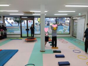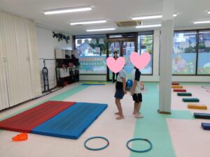フープジャンプ(パスしながら横ジャンプ)→平均台(立って後ろ向きでボールを渡す)→背中合わせでボール運び→トランポリン(ボールパス10回)プールスティックでボール移動→マット(さつまいも)