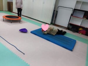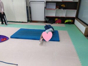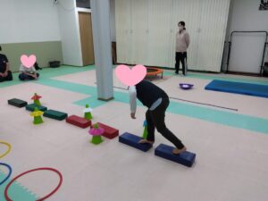 フープ・グーパージャンプ⇒平均台渡り(カップ色指定)⇒ジグザグカンガルージャンプ⇒さつまいも⇒トランポリン10回+タンバリンタッチ