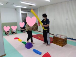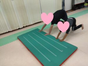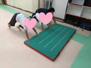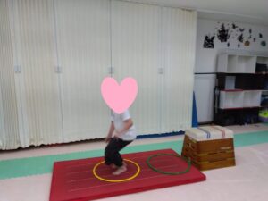 〇サーキット リズムフープジャンプ(①拍手2回②拍手3回③足でパーグーパー)⇒手押し車orイヌ歩き⇒カラーストーン・くねくね平均台⇒跳び箱ポイント着地(①前向き着地 ②③後ろ向き着地)