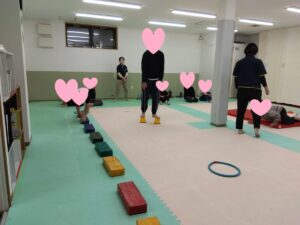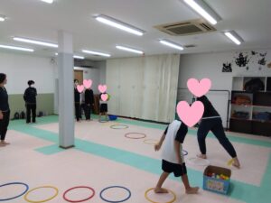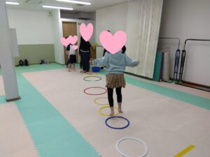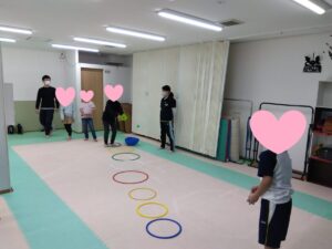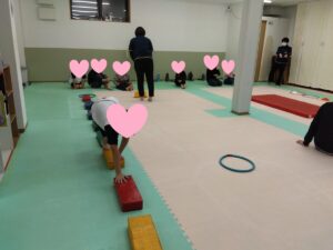 〇サーキット <外コース>平均台(クマ歩き)⇒アヒル歩き⇒クモ歩き⇒リズムジャンプ<内コース>ポックリ⇒おしり歩き⇒ゆりかご⇒マット(じゃがいも)