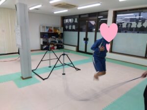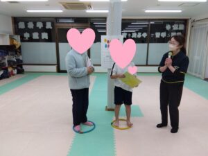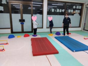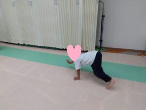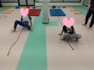 〇サーキット フープジャンプ+手動作 ⇒ ハードル横跳び ⇒ カラーストーン渡り ⇒ ジャンケン ⇒ サツマイモorジャガイモ ⇒ 動物歩き