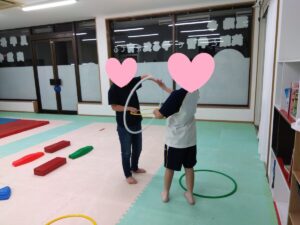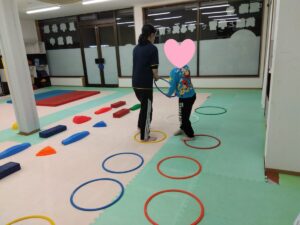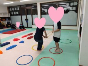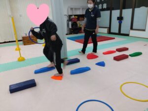 2人組(クロスジャンプ⇒フープくぐり⇒おしり歩き⇒平均台渡り⇒ゴムひもくぐり⇒さつまいも⇒跳び箱上り下り