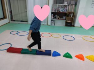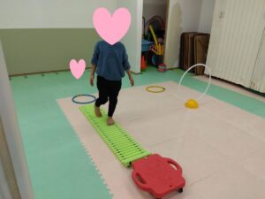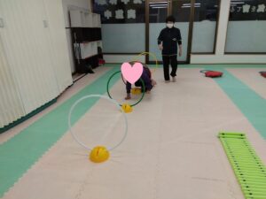 〇サーキット フープジャンプ⇒平均台・カラーストーン⇒バランス橋・コースター⇒フープくぐり2回目ハードルジャンプ⇒コロコロドッチボール