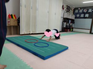 〇協力サーキット(リズムジャンプ/平均台イヌ歩き→風船あげながらマーカーボール置く→カラーストーン/バランス橋渡り→2人で片手キャンディボール運び)