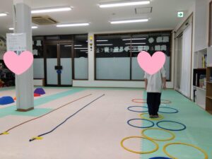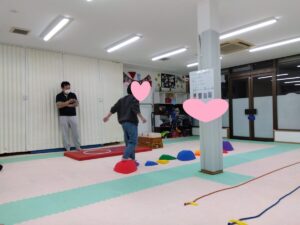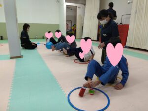 〇時間ぴったりで進もう(20~30秒)【フープグーパージャンプ→ロープくま歩き→カラーストーン渡り→跳び箱ポイント着地】